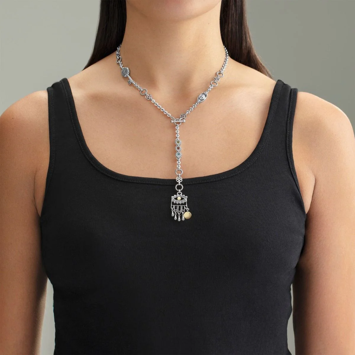 The medium length 18kt Gold and Sterling Silver Multi-Wear Eye Necklace is adorned with Tourmaline, London Blue Topaz, or Garnet. The necklace carries classic symbols that symbolize new beginnings like the eye with lotuses, and the key with the calligraphy inscription, ‘يا مفتح الأبواب’ – ‘Oh opener of doors’.