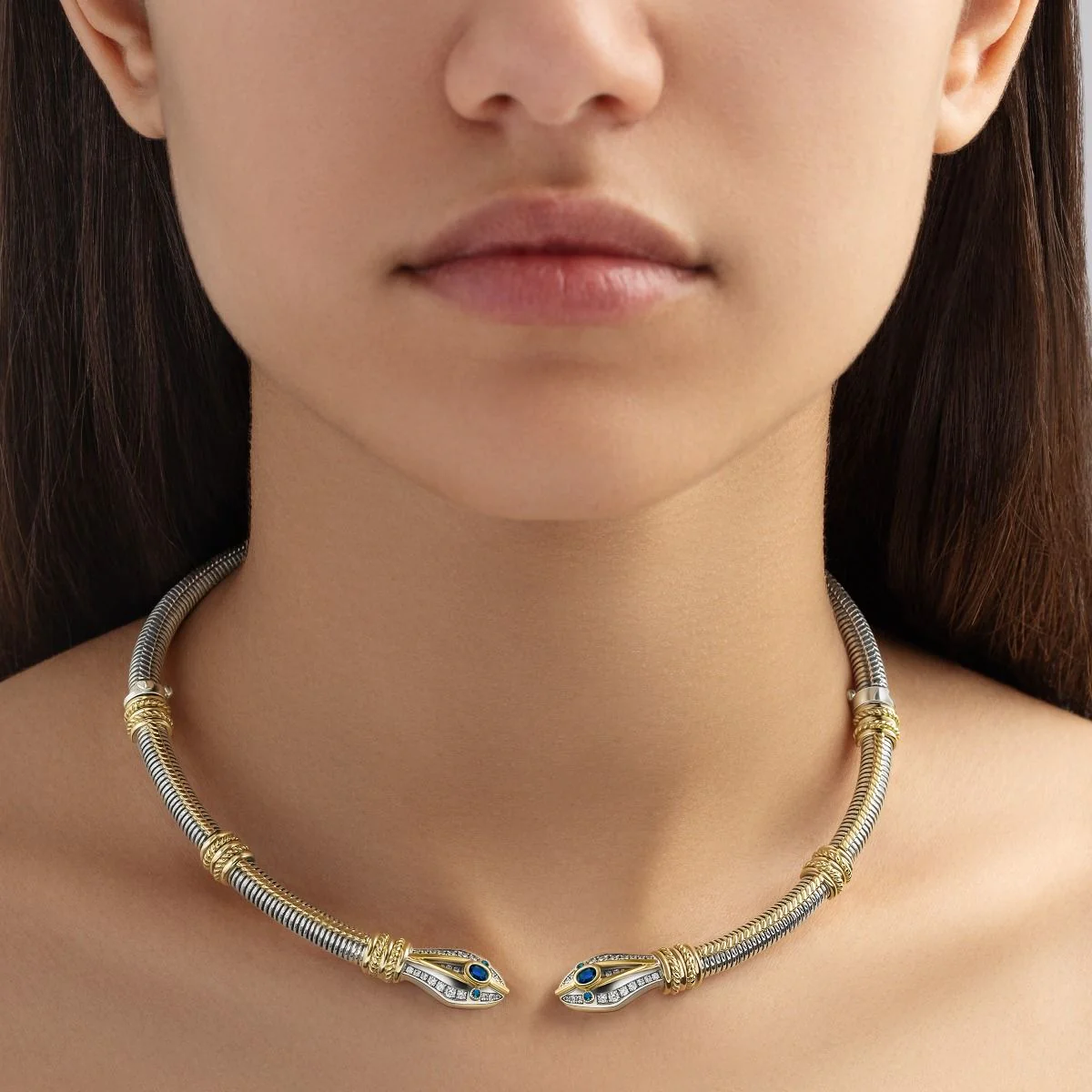 Much like a snake sheds its skin, and resurrects itself anew, a designer must too shed comfort, and reawaken their wonder to recreate vision and reimagine forms. The 18kt Gold and Sterling Silver Snake Collar revisits the enigmatic snake, a symbol that has traversed history and many cultures. An entirely new technique of fine twisted wirework was developed to give this snake its new skin. New beginnings call for new design outlooks.
