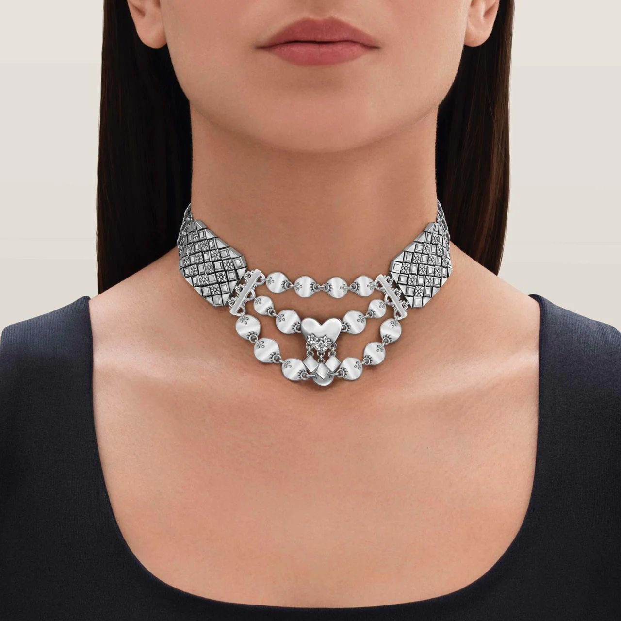 Sterling Silver piece that portrays a harmonious blend of cultures. This piece features Indian-inspired weaved links merged with our signature statemet chain . The centerpiece showcases a Fallahy heart, inscribed with our signature calligraphy 'الوصال' - 'Union' on its back. Drawing inspiration from Bedouin Yemeni and Armenian necklaces and pectorals, its silhouette embodies a rich heritage with a contemporary feel.